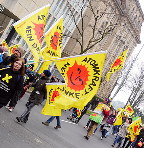Die Anti-Atom-Organisation .ausgestrahlt[1, 2, 3, 4, 5, 6] rief zusammen mit mehreren Partner-Gruppen aus Anlaß des 4. Jahrestags der Nuklearkatastrophe von Fukushima[7, 8, 9, 10, 11, 12] zur Demonstration in mehreren Städten[13] auf. Trotz zunehmend ungemütlichen Wetters fanden sich zahlreiche Gegner der sog. zivilen Nutzung der Kernenergie ein, um den sog. Volksvertreter[14] daran zu erinnern, diesen Ausstiegspingpong[15, 16, 17, 18] wie ursprünglich versprochen zu beenden.