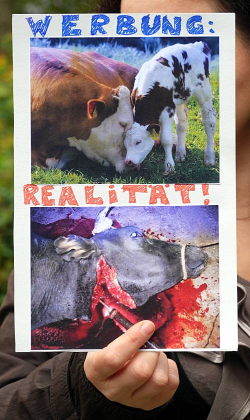 Schilder: 'Wegsehen entlässt niemanden auf der Verantwortung!' Fleisch ist Mord! und