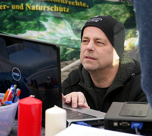 Christoph Küppers, der Anmelder und Organisator der Mahnwache, bereitete die Projektion eines Films über die Misshandlung der Delfine vor.