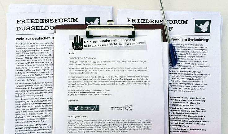 Informationsmaterial sowie Unterschriftenliste an unsere Friedensmutti, mit der Aufforderung, die deutsche Beteiligung am großen Morden in Syrien zu beenden
