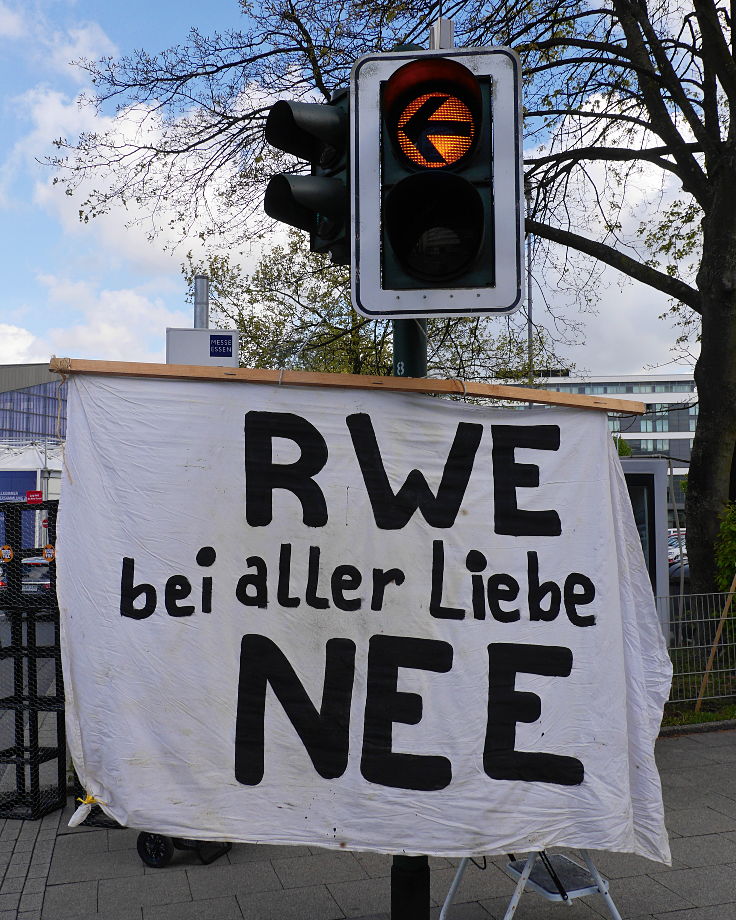 Der Dachverband der Kritischen Aktionärinnen und Aktionäre e.V.[1, 2, 3, 4], attac Köln[5, 6], die Initiative Buirer für Buir[7, 8], sowie zahlreiche weitere Gruppen und Personen riefen zum Protest vor der RWE-Hauptversammlung in Essen auf gegen den unverminderten Braunkohle-Kurs von RWE in Zeiten des globalen Klimawandels[9, 10, 11, 12, 13, 14, 15].