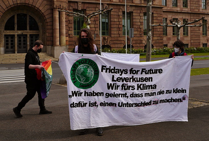 Banner: Fridays for Future Leverkusen – Wir fürs Klima – "Wir haben gelernt, dass man nie zu klein dafür ist, einen Unterschied zu machen."[88]