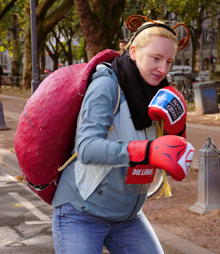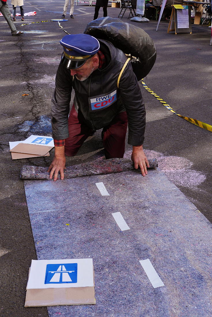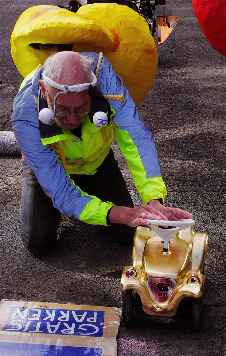 Zur Verdeutlichung der Verkehrstele... Verkehrsproblematik schnallte sich die Fahrrad-Aktivistin Anja Vorspel[104, 105, 106] das Gehzeug[107, 108, 109] um.