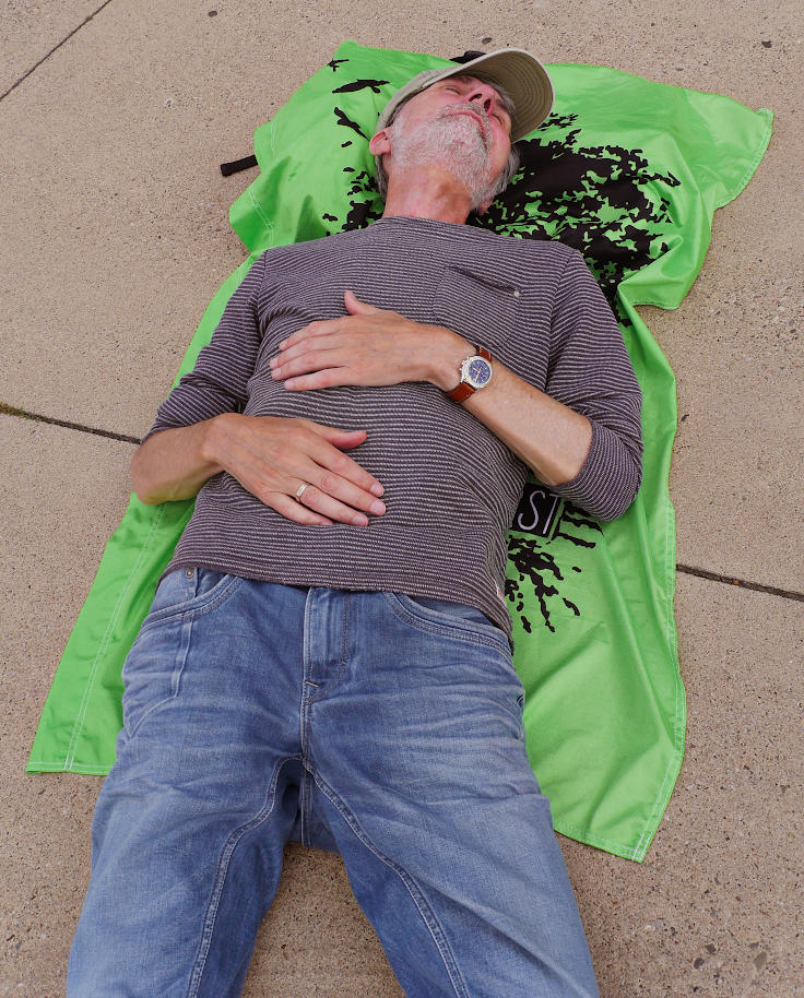 Zur Visualisierung des 6. Massenaussterbens[28, 29, 30, 31, 32, 33] führten die AktivistInnen zu Beginn der Abschlusskundgebung gemeinsam ein Die-in[34] durch, welches von den Red Rebels[35, 36] unterstützt wurde, die auf magische Art und Weise auftauchten, bei einer besinnlichen Instrumentalmusik die verlorenen Arten betrauerten und ebenso geheimnisvoll wieder verschwanden.