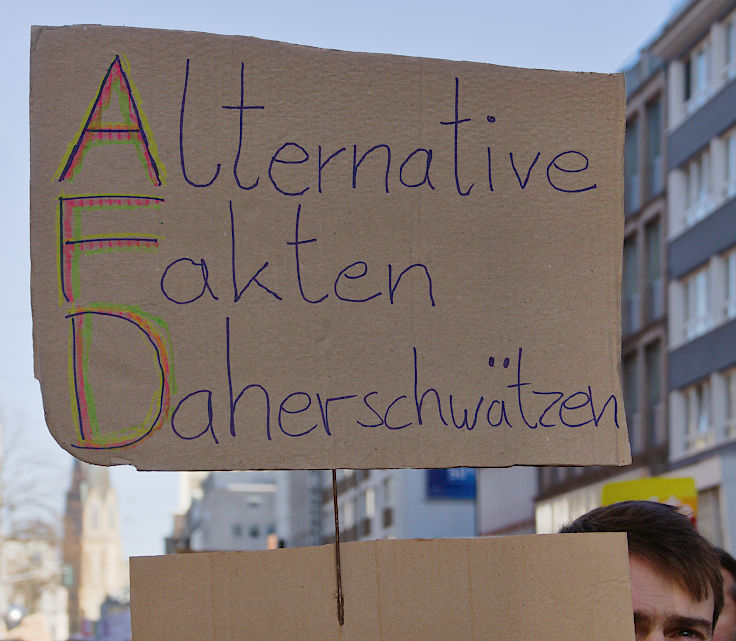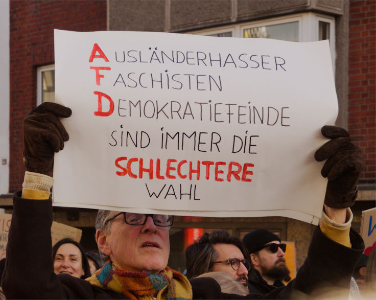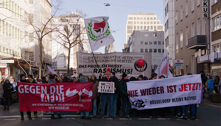 Nach der Publikation des Medienhauses CORRECTIV[1, 2, 3, 4, 5, 6, 7] zum Treffen der AfD unter dem Titel Geheimplan gegen Deutschland[8] (siehe auch die Aktualisierung[9] sowie den Liveticker[10], das Recherche-Informationsvideo[11] und die MONITOR-Recherche zur Finanzierung der rechten Kooperation[12]), schreckte die demokratie[13, 14, 15, 16]-ge- und -verwöhnte breite Zivilgesellschaft auf und es fanden zahlreiche Demonstrationen in vielen Städten Deutschlands gegen Faschismus und Fremdenfeindlichkeit statt. In Düsseldorf[17, 18, 19, 20, 21, 22, 23] protestierten rund 100.000 Menschen[24, 25, 26, 27] gegen die menschenverachtende Politik der AfD.[28, 29, 30]