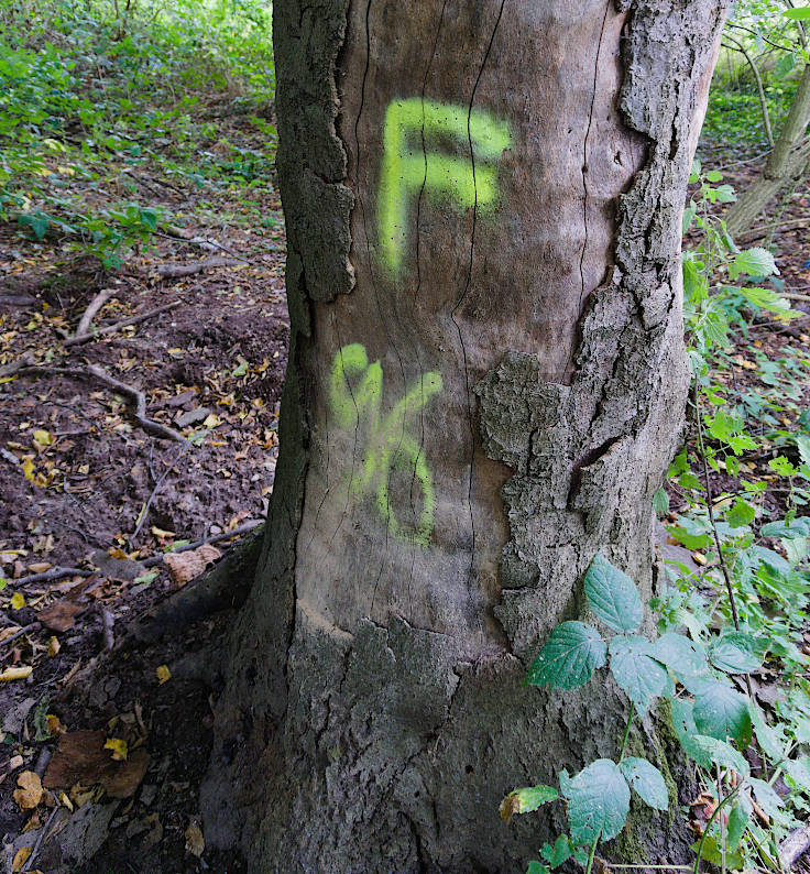 Der offiziellen Geschichtsschreibung vom Der Hambi[1, 2, 3, 4, 5] ist gerettet auf den Leim zu gehen, ist vielleicht etwas naiv.[6, 7, 8, 9, 10] Anhand des Teilstücks des Manheimer Erbwalds, in dem seit kurzer Zeit etliche Bäume mit durchnummerierten Buchstaben-Zahlen-Kombinationen[11] markiert sind, muss im Kontext der zum 1. Oktober beginnenden Rodungssaison[12, 13] und der schrecklichen Erfahrung der rücksichtslosen Vernichtung des Bochheimer Wäldchens im Herbst 2021[14, 15, 16] (also nur zwei Jahre nach dem politischen Beschluss, den Hambacher Wald zu erhalten[17, 18] und trotz hochtrabendem ökologische Trittsteine-[19] und Waldbereiche werden miteinander vernetzt[20]-Geredes), nun auch hier – 6 Jahre nach dem tragischen wie unnötigen Tod von Steffen Meyn[21, 22, 23, 24] – mit dem Allerschlimmsten und dass sich die Bilder wiederholen, gerechnet werden. Daher formiert sich gerade eine weitere Besetzung dieses Teilstücks des Waldes[25], der den Plänen von RWE[26] zur Abraumgewinnung zur Schaffung der geplanten Manheimer Bucht[27, 28] sowie dem einträglichen Kies-Geschäft, im Wege steht. Der Naturführer und Waldpädagoge Michael Zobel[29, 30] und Eva Töller luden ein zur Waldführung am Rande von Manheim[31], um sich ein Bild des Geschehens vor Ort zu machen und die WiderständlerInnen miteinander ins Gespräch zu bringen.
