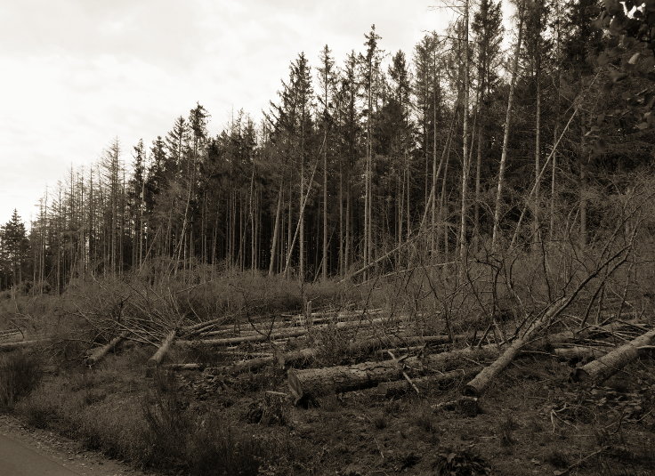 Die einheimischen Laubbäume aber kommen scheinbar mit dem sich ändernden Wetter besser zurecht.[32] Impressionen einer im Kontext einer nachhaltigen[33, 34, 35] Fahrradreise beobachteten Naturkatastrophe, die nicht irgendwo auf der Welt, sondern quasi direkt vor der eigenen Haustüre stattfindet.