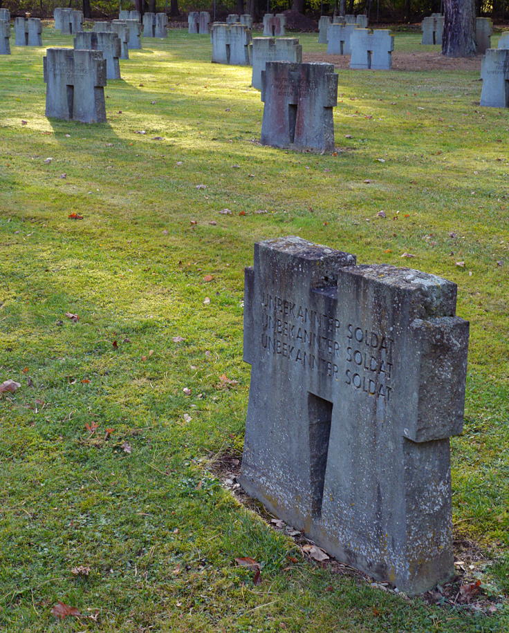 Als Teil der deutschen Vergangenheitsbewältigung Vergangenheitsaufarbeitung[1, 2, 3, 4, 5] und der kontrovers diskutierten Erinnerungskultur gibt es an vielen Orten die Kriegsgräberstätten[6, 7] bzw. Soldatenfriedhöfe[8], auf deren Arreal deutsche und internationale gefallene Soldaten und ZivilistInnen in teils recht goßer Anzahl begraben wurden. Sie sind in ihrer (kultur- und kunsthistorisch bedingt entstandenen) Schlichtheit und Gleichförmigkeit (Gräber wie Soldaten mit Namensnennung, aber ohne individuelle Kennzeichen, wie in Reih und Glied) ein eindringliches Symbol der Trauer und Erinnerung und ein Zeugnis der düsteren Geschichte, aber auch (nach heutigem Verständnis) ein Mahnmal, diesen Fehler des Krieges niemals zu wiederholen. Es gilt zu bedenken, dass hier keine Kriegshelden[9, 10] begraben sind, sondern Opfer, Täter und Erfüllungsgehilfen beiderseits eines überflüssigen Krieges. Für Nationalismus[11, 12], Geschichtsrevisionismus[13, 14, 15] und Heldenverehrung[16, 17] ist hier kein Platz. Denn es ist kein Privileg, dort zu liegen, sondern – für Deutsche und Nicht-Deutsche gleichermaßen – vor dem Hintergrund all der zerstörten Biographien und Familien, schlichtweg ein Desaster! Bedeutsam für das Verständnis ist aber immer auch die individuelle Historie des jeweiligen Friedhofs, der in seiner Gestaltung und Einbettung in die umliegende Landschaft sowie der (heutzutage) teils verstörenden Benennung[18], ein Abbild des damaligen Zeitgeistes[19] sowie des Denkens und Empfindens des gestaltenden Architekten ist. In ihrer Gesamtheit, der Intention und dem Symbolismus sind diese Anlagen daher bis heute stets kontroverse Werke.